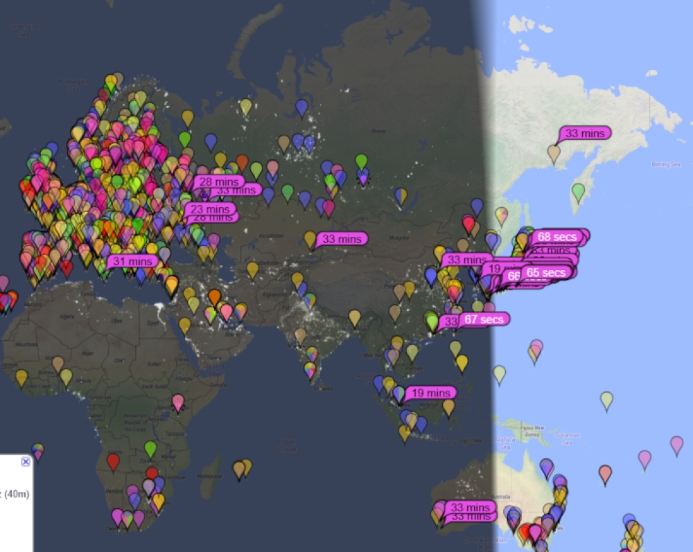 今朝は5時にトイレに起きてしまったので試しに3.5MHzでFT8を覗いてみたらケニアの5Z4VJが -18で入感していたので100Wでコールしてみたけれど応答なし。3.5MHzでアフリカの信号をキャッチしたのは初めて。ためしにPSK Reporterで調べてみたら、下の図の通り僕の電波はアフリカなんぞに到達していなかった。